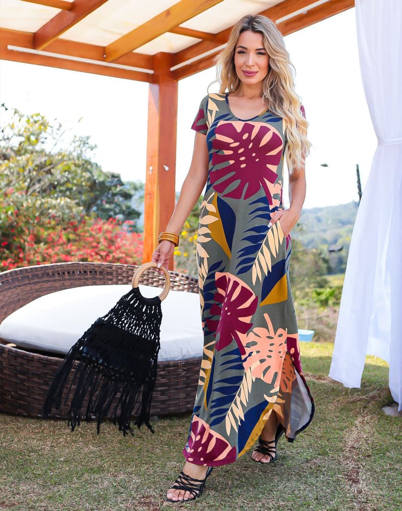 O vestido Egeu é o nosso lindo, moderno e confortável básico longo, com fenda lateral e bolsos.